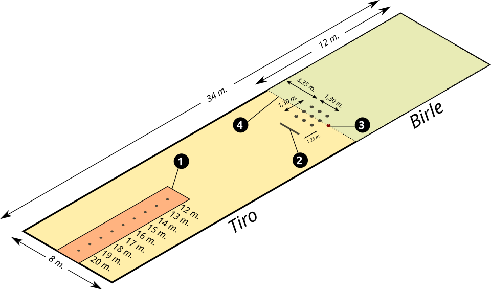 - El tiro: es la primera zona. Se trata de una superficie alargada, generalmente de cemento, donde se colocan varios pivotes separados aproximadamente un metro entre sí. Desde aquí se realiza el primer lanzamiento.